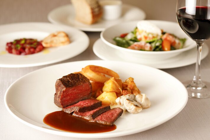 魚料理は、脂ののったノルウェーサーモンをふっくらと焼き上げ、爽やかなハーブとトマトの酸味が広がる濃厚なオランデーズソースで仕上げました。コースの主役には、厳格な基準をクリアした「プライムビーフ」のローストをご用意。丁寧に火を入れ、肉本来の力強い旨みを引き出した逸品です。