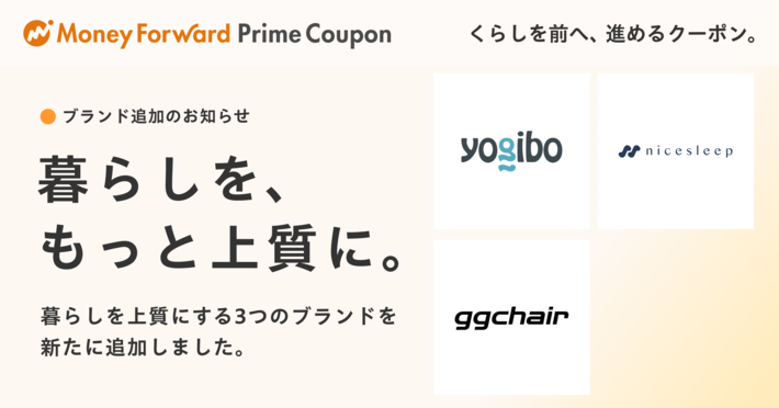 マネーフォワードホーム株式会社は、お金の見える化サービス『マネーフォワード ME』プレミアム会員限定「Prime Coupon(プライムクーポン)」において、本日2026年3月13日(金)より新たなクーポンを提供開始します。「暮らしを、もっと上質に。」をテーマに、快適すぎて動けなくなる魔法のソファ「Yogibo」、家具と家電のレンタル・サブスク『CLAS』を運営する、株式会社クラス発のマットレス購入プログラム「nicesleep(ナイススリープ)」、試せる・返せるゲーミングチェア専門店「gg-chair(ジージーチェア)」を新たな提携ブランドとして迎えました。