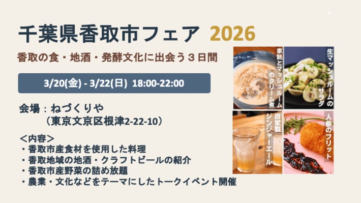 香取市地域おこし協力隊の関係人口創出チームが中心となり、香取市の食や発酵文化、地域の魅力を都内で体感できる「千葉県香取市フェア」を、東京都文京区根津の飲食店「ねづくりや」で開催します。香取市産の食材を活かした料理や香取地域の地酒などを楽しめるほか、香取市民にもご協力いただき、香取の人や暮らし、地域との関わり方をテーマにしたトークイベントを3日連続で実施します。香取市の魅力を“食”を通じて知っていただける機会ですので、ぜひご来店ください。
