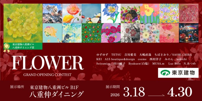 GRAND OPENINGを記念して、同時期にYNK(八重洲・日本橋・京橋)エリア一帯で開催予定のMeet with Flowersと連動し、「FLOWER」をテーマとしたアートコンテストを実施しました。公募作品から選考した17作品が入選、東京建物八重洲ビル 八重仲ダイニング賞1作品が決定しました。入選作品については、八重仲ダイニングGalleyにおいてデジタル展示を実施します。