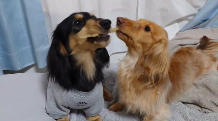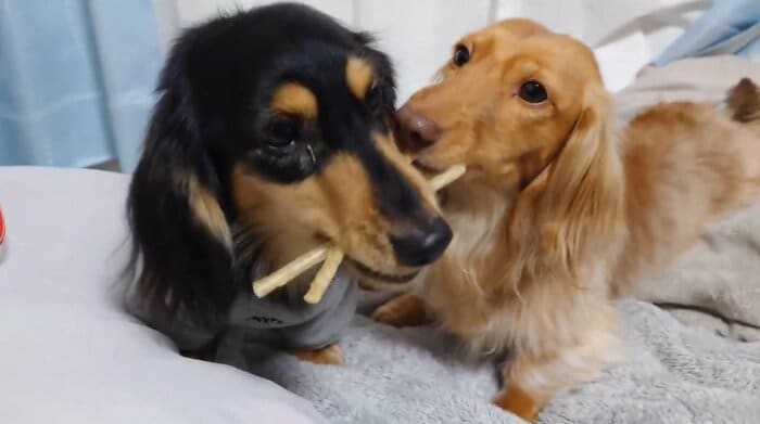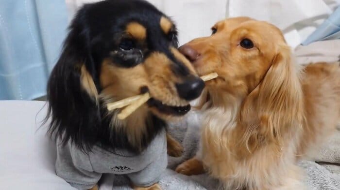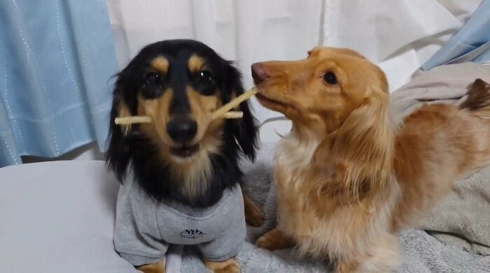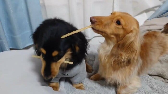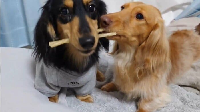 今回の動画を見てみると、なんとおやつのガムを2本くわえるマロくんと、すぐ近くで1本のガムを離さないようにくわえているなぎちゃんの姿が!