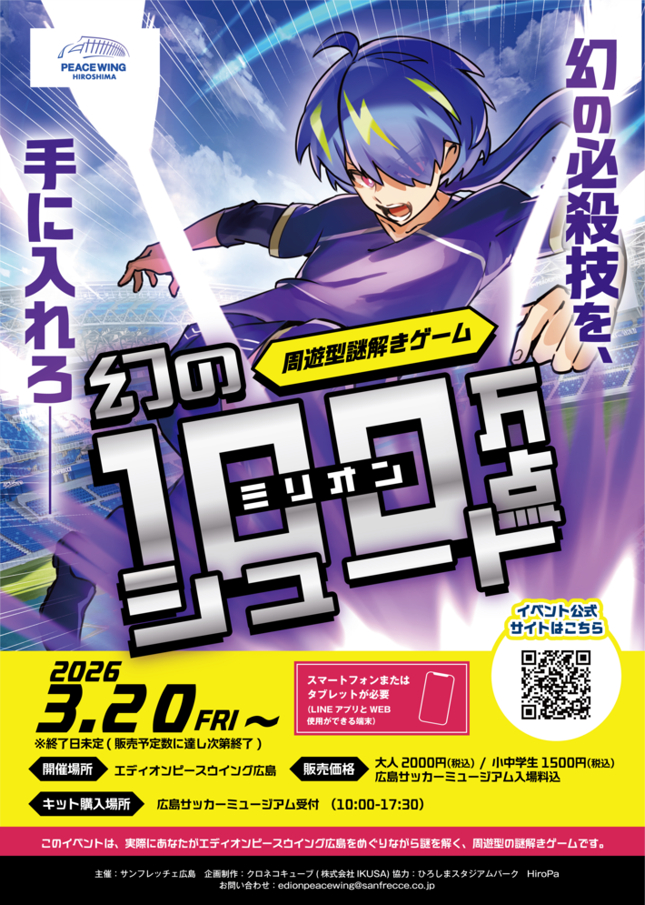 あそび総合カンパニー株式会社IKUSA(本社:東京都豊島区、代表取締役:赤坂大樹、以下IKUSA)は、2026年3月20日(金・祝)より、エディオンピースウイング広島にて開催する周遊型謎解きゲーム「幻のミリオンシュート」(主催:サンフレッチェ広島)を企画・制作しました。