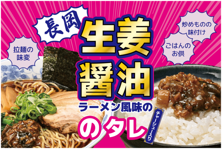 新潟のソウルフード「長岡生姜醤油ラーメン」が万能タレになった!生姜が効いた醤油ベースの万能タレ。チャーシューなどラーメンの具材入りの本格派。くせになる美味しさで白米が無限に消える!ラーメンをぶっかけろ