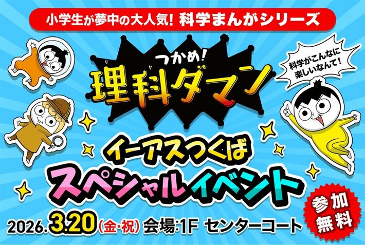 株式会社マガジンハウス(本社:東京都中央区、代表取締役社長:鉄尾周一)が刊行する、日韓累計350万部超えの大人気学習まんが『つかめ!理科ダマン』シリーズのスペシャルイベントを、2026年3月20日(金・祝)に茨城県つくば市の北関東最大級ショッピングセンター「イーアスつくば」にて開催いたします。
