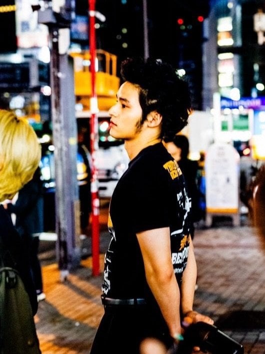 ネオンが輝く夜の繁華街に立つ姿を写したショットでは、腕を背中の後ろで組み、背を少し反らせながら静かに遠くを見つめています。先ほどの激しい表情とは打って変わり、落ち着いた横顔からは、夜の街に溶け込むような哀愁と渋さが漂います。