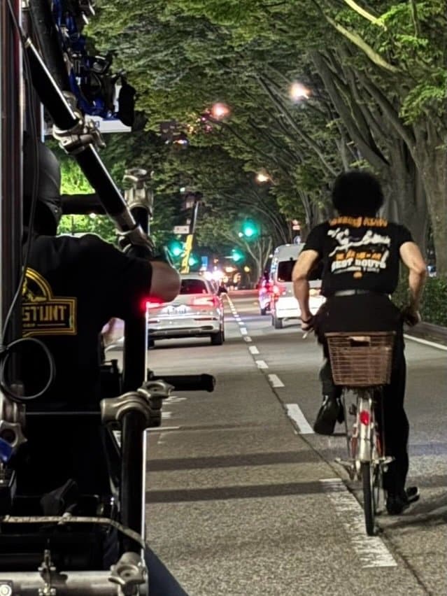 さらに、夜の街路を自転車で駆け抜ける躍動感あふれるカットも公開。画面の左手前には、自転車に乗った水上さんを追いかけるスタッフが機材を操作する姿も写っており、緊迫した撮影現場の空気がダイレクトに伝わってきます。