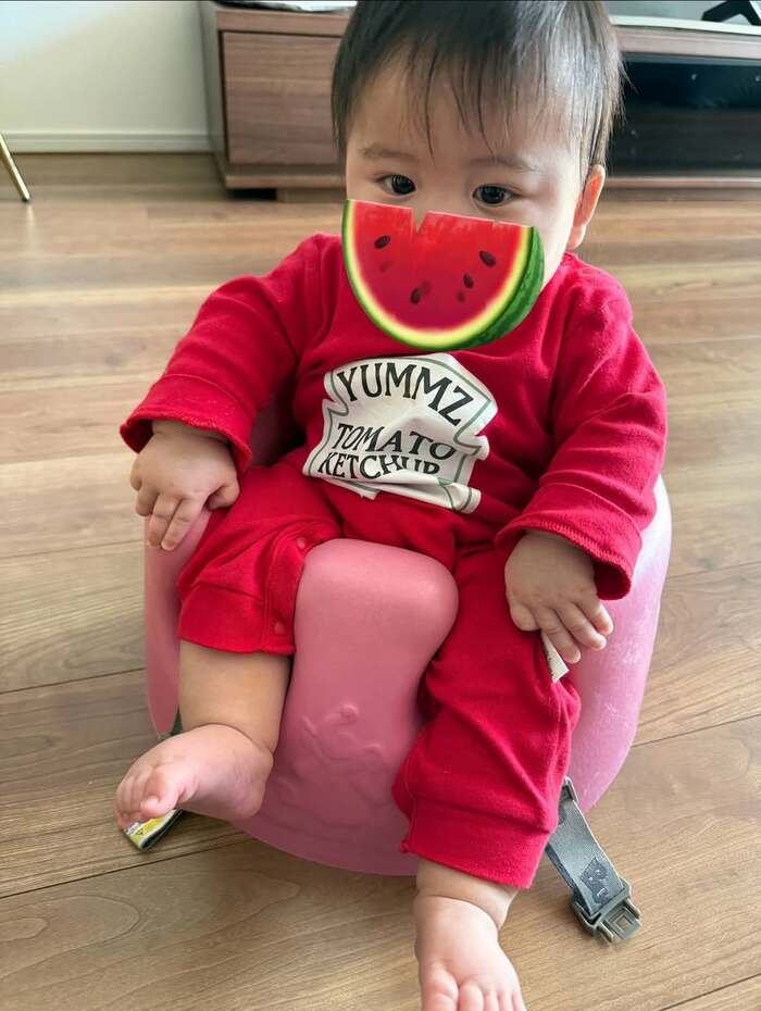 ベビーチェアにちょこんと座ったお兄ちゃんの姿も。収まりよくどっしりと座る様子がなんともかわいらしいですね!