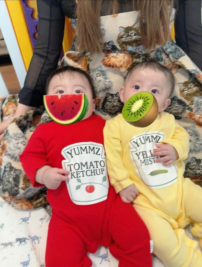 公開された双子を見てみると、お兄ちゃんは赤色の“ケチャップ”、弟くんは黄色の“マスタード”仕様に変身!