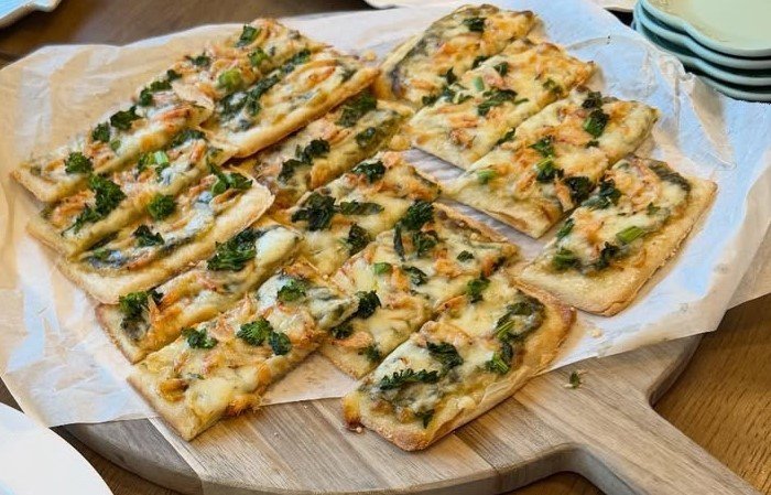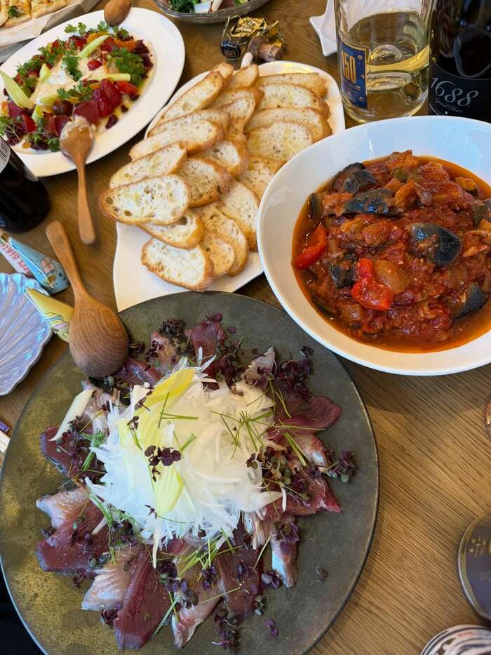 こんがりと焼き目が付いたエビや野菜などが乗ったピザのようなものや・・・