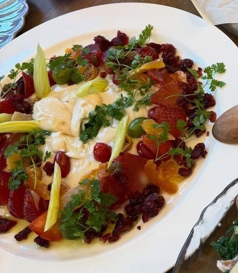 ドライフルーツが散りばめられたチーズが真ん中に乗ったオシャレな一皿に・・・