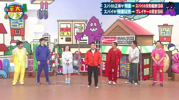 博多華丸さん、博多大吉さん、千鳥(大悟さん、ノブさん)、山内健司(かまいたち)さんを含めた7人のうち1人は、事前にくじ引きで決定した“スパイ”で、ほかのメンバーにバレないようにゲームを失敗させようとします。