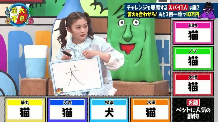 しかし、「ペットに人気の動物」がお題に出されると、みなが「猫」と書くなか、井上さん1人だけが「犬」と書いて、全員一致ならず。