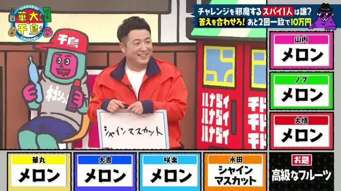 「高級なフルーツ」がお題に出されると、みなが「メロン」と書くなか、水田さん1人だけが「シャインマスカット」と書いて、全員一致ならず。