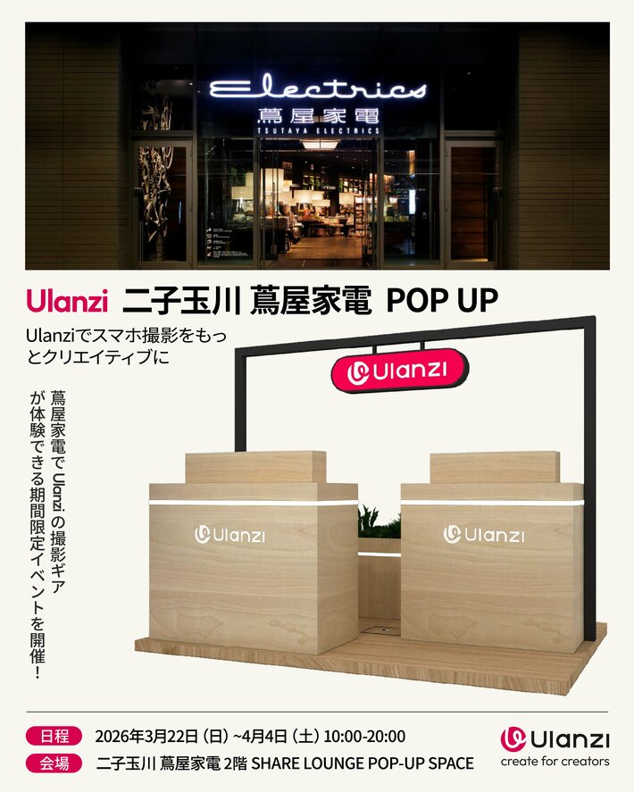 Ulanzi(ウランジ)は、2026年3月22日(日)に二子玉川 蔦屋家電 2階 E-room1・2・エスカレーター前にて開催される『ガジェット展示会2026春』に出展いたします。会場では、最新かつ人気のスマートフォン撮影アクセサリーを実際に手に取って体験できる展示を実施するほか、社長による「Ulanziでスマホ撮影をもっとクリエイティブに」をテーマにしたトークセッションや、豪華景品が当たる抽選会なども予定しています。著名携帯電話研究家・山根康宏氏も来場・出展いたします。さらに、2026年3月22日(日)から4月4日(土)まで、二子玉川 蔦屋家電 2階 SHARE LOUNGE POP-UP SPACEにてPOP-UPイベントも開催し、展示会・POP-UPを問わず、Ulanzi 全製品が 20% オフとなります。