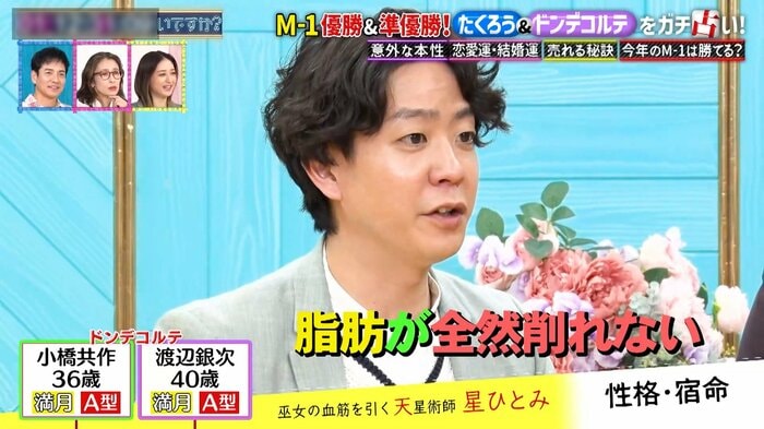 相方の小橋さんは、星さんから「欲望に素直でガマンが下手」と占われると、「めちゃくちゃ分かります」とうなずきました。「カッコよくなりたくて筋トレをしてるんですけど、お酒をガマンできなくて飲んじゃうので、脂肪が全然削れない」と告白。