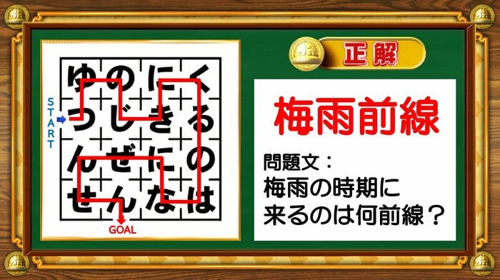 正解は「梅雨前線(つゆのじきにくるのはなにぜんせん?/梅雨の時期に来るのは何前線?)」。