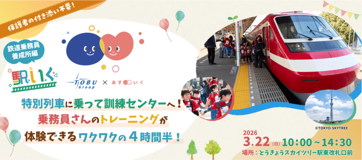 一時保育検索・予約サービス「あすいく」、および体験型一時保育サービス「ワクいく」を運営する株式会社あすいく(本社:東京都港区、代表取締役:幸脇 啓子)は、東武グループと連携し、体験型一時保育プログラム『駅いく in 鉄道乗務員養成所』を2026年3月22日(日)に開催します。