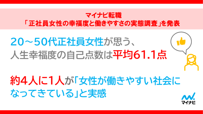 株式会社マイナビ(本社:東京都千代田区、代表取締役 社長執行役員:粟井俊介)が運営する総合転職情報サイト『マイナビ転職』(https://tenshoku.mynavi.jp/)は、正社員女性800名に聞いた、「正社員女性の幸福度と働きやすさの実態調査」の結果を発表しました。
