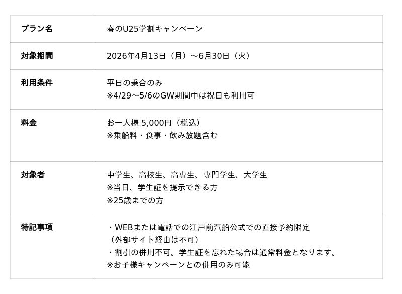 江戸前汽船株式会社(東京都江東区新木場、代表取締役:後藤武彦)は、冬に開催して大人気を博した「江戸前汽船 学割キャンペーン」を、2026年4月13日(月)から6月30日(火)までの期間で再開催を決定いたしました。