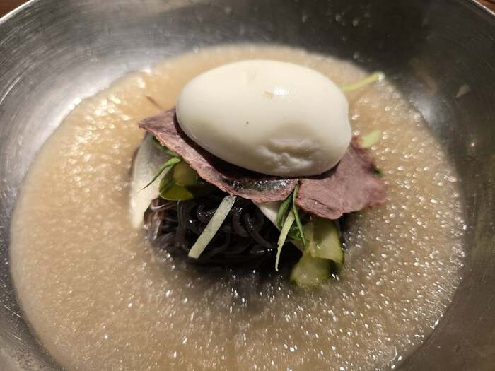 続けて「クズ冷麺も 美味しい!!!」とつづり、シャーベット状に凍った牛骨スープにもちっとした黒っぽい細麺が浮かんだ冷麺も披露。さっぱりとした味わいやつるりとしたのどごしが想像できます。