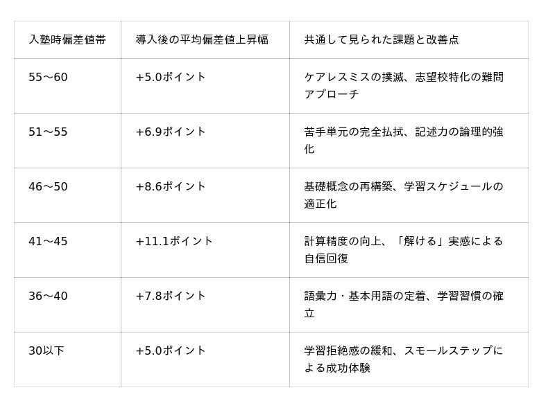 以下の表は、入塾時の偏差値帯ごとに、個別指導導入後にどれほどの偏差値向上が見られたかをまとめたものです。