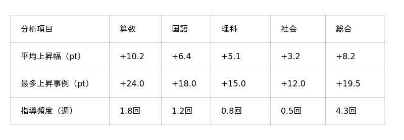 分析の結果、最も大きな伸びを示したのは算数であり、平均上昇幅は+10.2ポイントと他科目を大きく上回りました。
