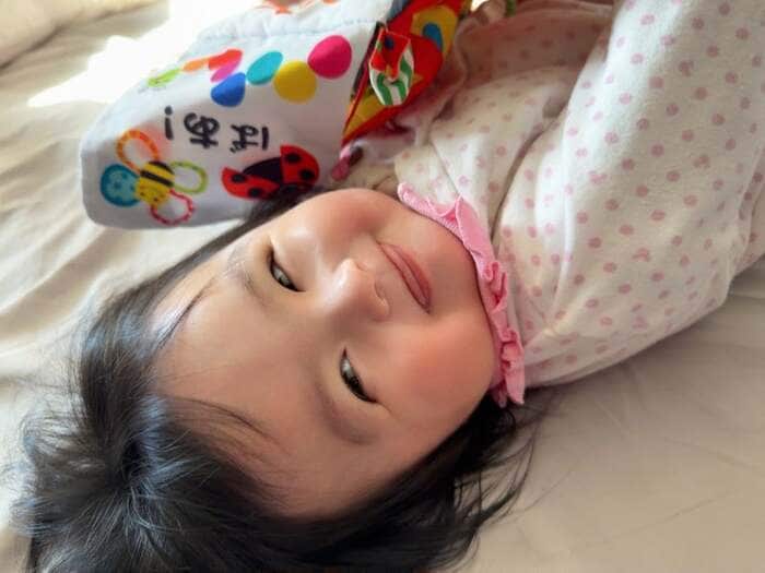 そこには、マットの上にあおむけで寝転び、舌をペロッと出してにっこにこな表情を浮かべる“ググガガちゃん”の姿が。近くにはてんとう虫やチョウチョが描かれたおもちゃがあり、楽しく遊んでいるようです。