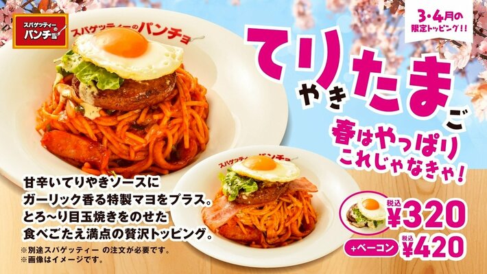 「“楽しい”でつながる世界をつくる」を理念とする飲食企業である株式会社ファイブグループ(本社:東京都武蔵野市、代表取締役社長:坂本 憲史)の関連企業である、株式会社パンチョ(本社:東京都武蔵野市、社長:野尻 圭介)が運営する『スパゲッティーのパンチョ』は、期間限定トッピング「てりたま」「ベーコンてりたま」を2026年3月16日(月)に発売します。