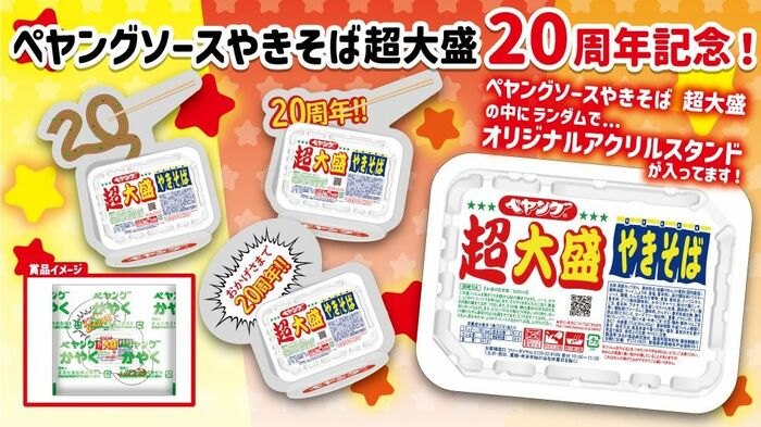 担当者によると、「ペヤングソースやきそば超大盛」が20周年ということで、何か記念に残るような手軽で若者にも人気のあるアクリルスタンドを採用したんだとか。