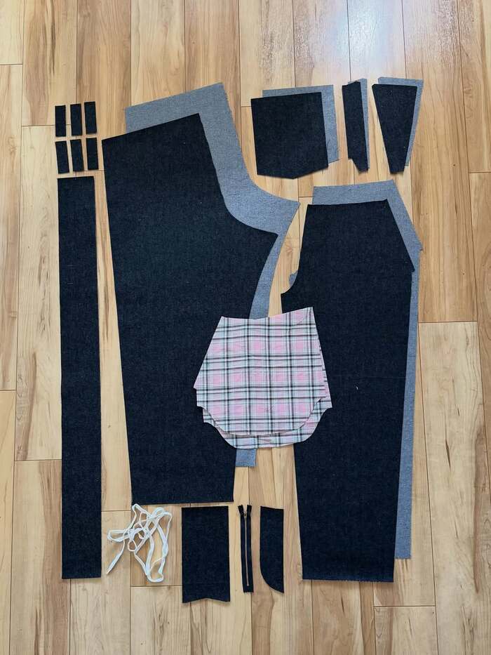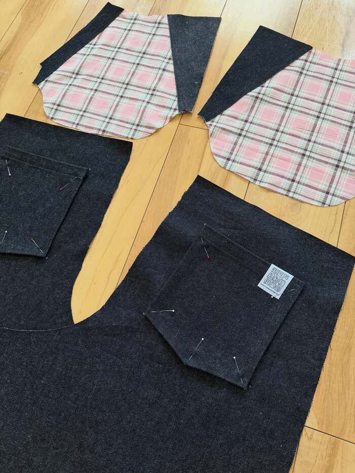 生地を組み合わせて下準備をしている制作途中のショットでは、パンツのお尻部分となる生地にポケットとなる小さな生地をまち針でとめているようです。細部までしっかりと準備していることから、コカドさんのきちょうめんさがうかがえます。