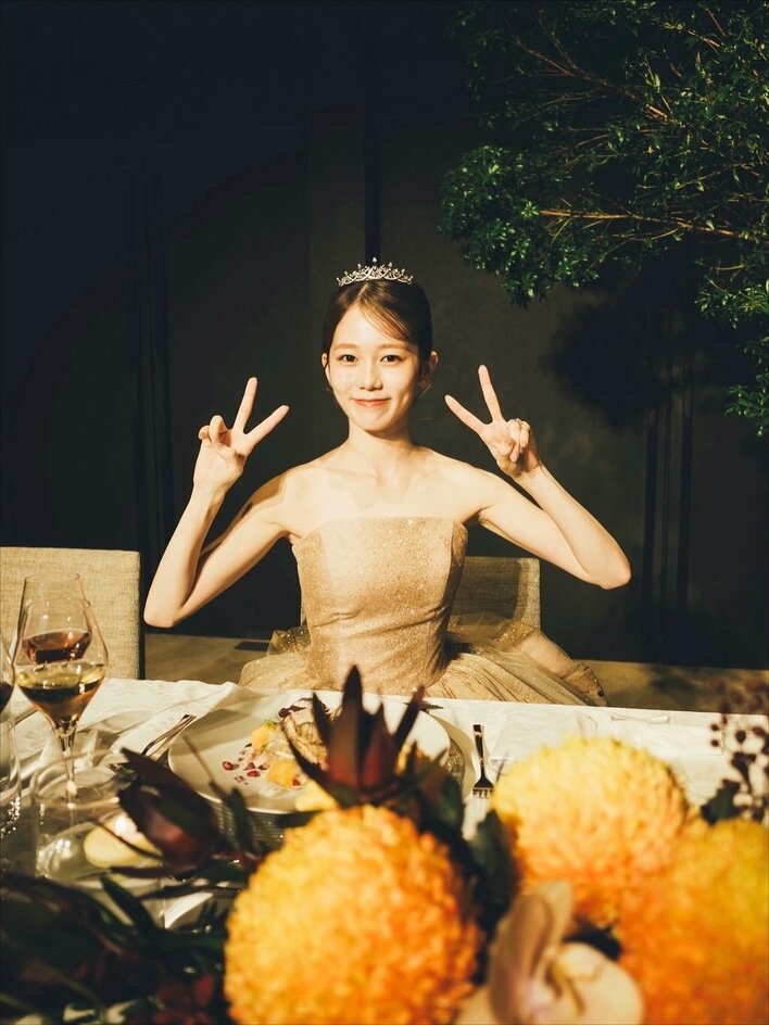 2025年10月には、結婚披露宴でのショットを公開し、シャンパンゴールドの上品なドレスをまとい、笑顔でピースサインする姿が披露されていました。
