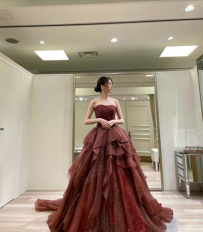 まずは、深みのあるボルドーカラーのドレス。ドレスにはきらめくラメが全体的に散りばめられていて、ウエストから幾重にも重なったフリルがふんわりと広がっているデザインが印象的です。ドレスをまとった姿はまるで映画のワンシーンを切り取ったかのようで、エレガントな雰囲気が漂っています。
