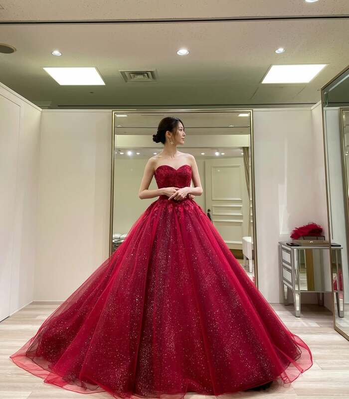 そして、2着目は鮮やかなレッドカラーが目を引くドレス。こちらも全体的にラメが散りばめられていて、たっぷりとしたボリューム感のあるスカートが圧倒的な華やかさを放っています。
