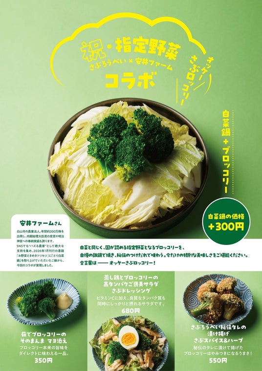 石川県のソウルフードとして、75年に渡り愛される「さぶろうべい」を展開する株式会社SU-BEE(本社:石川県金沢市、CEO:田端 弘一)は、SNS総フォロワー数約28万を誇る農業法人 有限会社安井ファーム(本社:石川県白山市、代表取締役:安井 善成)とコラボレーションし、2026年3月19日(木)より、安井ファームのブロッコリーをふんだんに使用した特別メニューの提供を開始いたします。 約半世紀ぶりに国の「指定野菜」へ追加されることで大注目のブロッコリーを、石川県のソウルフード「とり白菜鍋」にトッピングするほか、さぶろうべい秘伝のタレに漬けて揚げたブロッコリーなど、一品料理も提供。内閣総理大臣賞の受賞歴も持つブロッコリーのトップランナーと、石川県を代表するローカルチェーンの強力タッグで、ブロッコリーの新たな魅力を発信します。