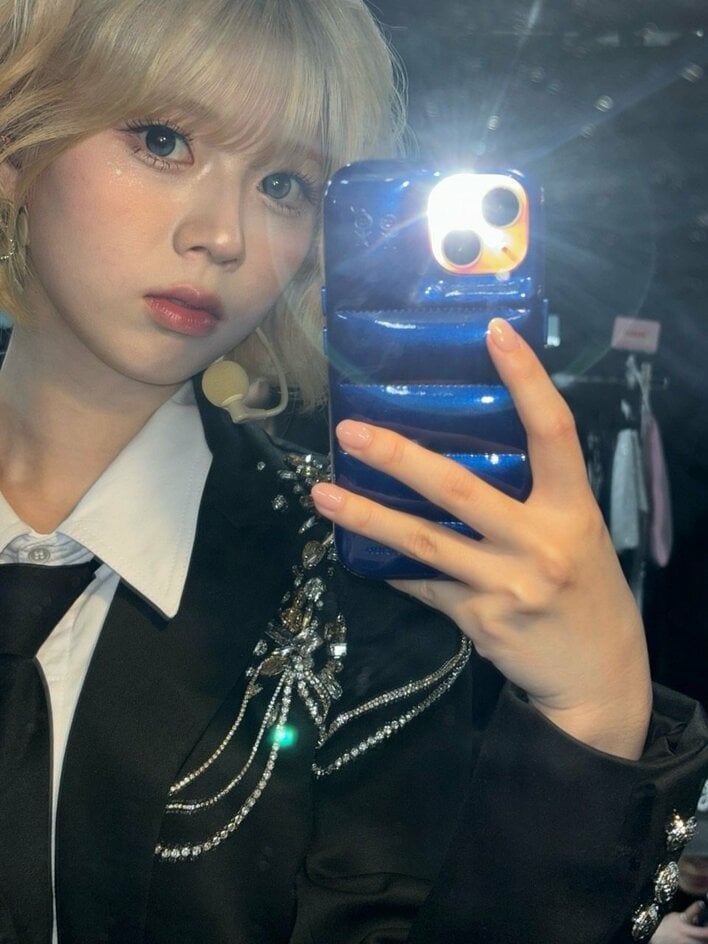 鏡越しの自撮りショットでは、かなりの至近距離からカメラを見つめていて、うるうるな大きな瞳やつやつやの肌に、目を奪われます。
