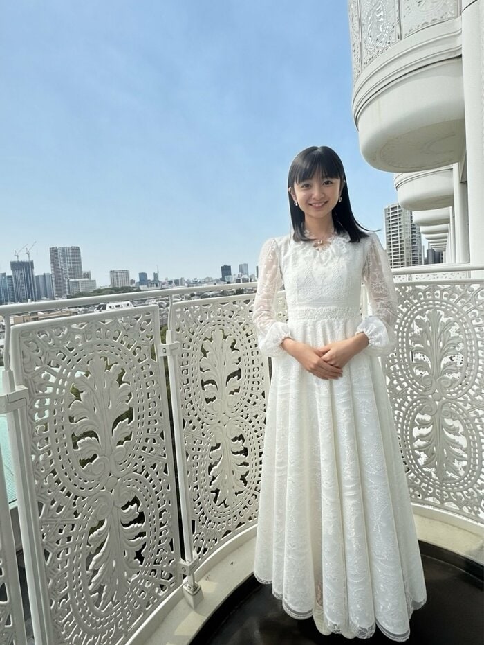 写真には、高層ビルが立ち並ぶ都市景観と青空をバックに、腕部分がレースになった白のドレスを着こなす、優しげな笑顔を浮かべた白山さんの姿が。ふんわりとしたパフスリーブと繊細な花柄の刺しゅうが特徴的で、思わず見入ってしまいます。