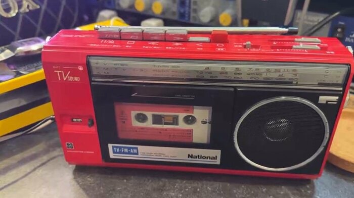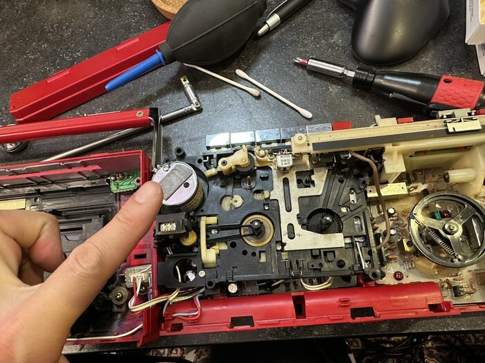 デスクの上には、内部が丸見えになったカセットデッキが!円形のパーツやモーターと思われる部品などがあり、一見どこを直したら良いのか困惑してしまいそうです。