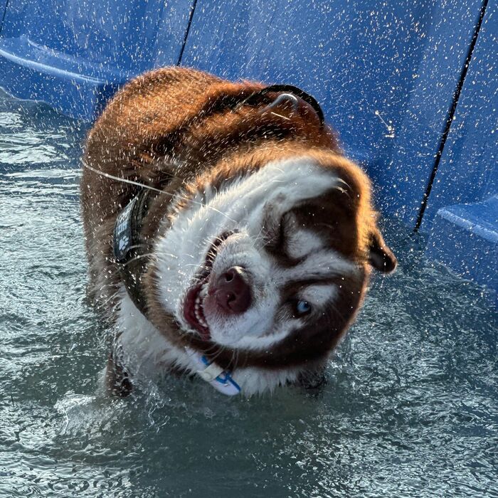 舌をペロリとのぞかせ歯を食いしばり、水に濡れた体をぶるぶるさせる大吉くん。