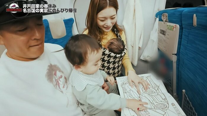 井戸田さんの膝の上に座った兄バーグは塗り絵で遊んでいます。そして、蜂谷さんは抱っこひもを使ってチビバーグを抱っこ。家族仲良しな姿にほっこりします。