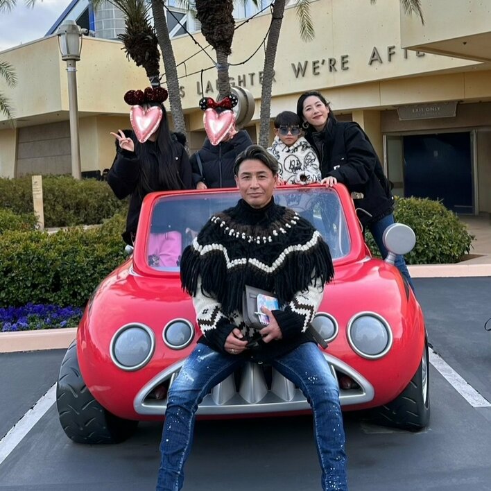 そして、ディズニー/ピクサー映画『モンスターズ・インク』に登場する、マイク・ワゾウスキの赤い車とともに、家族5人で記念写真をパシャリ!子どもたち3人と矢沢さんは車の中に乗り、魔裟斗さんはボンネットの真ん中に腰をかけていて、その姿はまるで家族を守る大黒柱のよう。