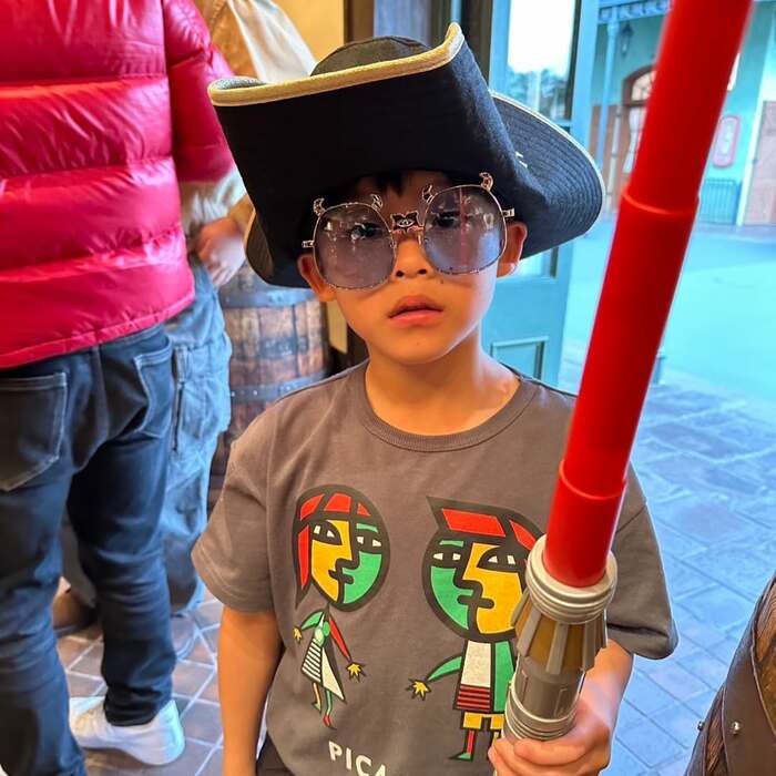 公開された写真には、海賊のコスチュームのようなつばの広い三角型のハットをかぶり、カラーレンズのサングラスをかけた長男の姿が。