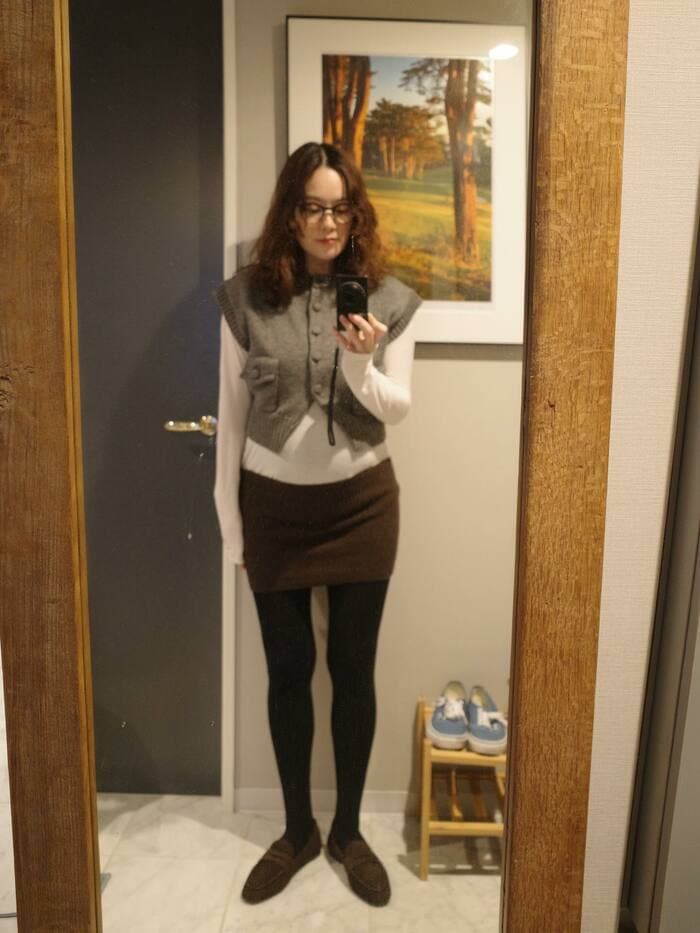 全身鏡の前に立ち自撮りをしたショットを見ると、白の長袖にグレーのベストを重ね、ブラウンのミニスカートを合わせたコーデに。スラッとした美脚に思わず見とれてしまいます。