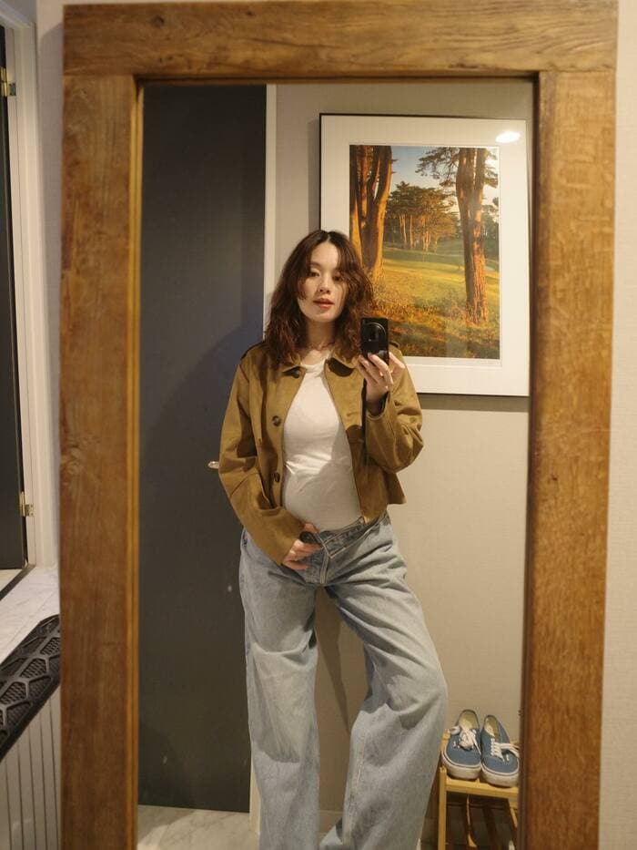 また、カーキ色のジャケットに淡い色のデニムパンツというカジュアルコーデでポーズを決めてみたり…。