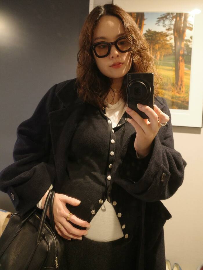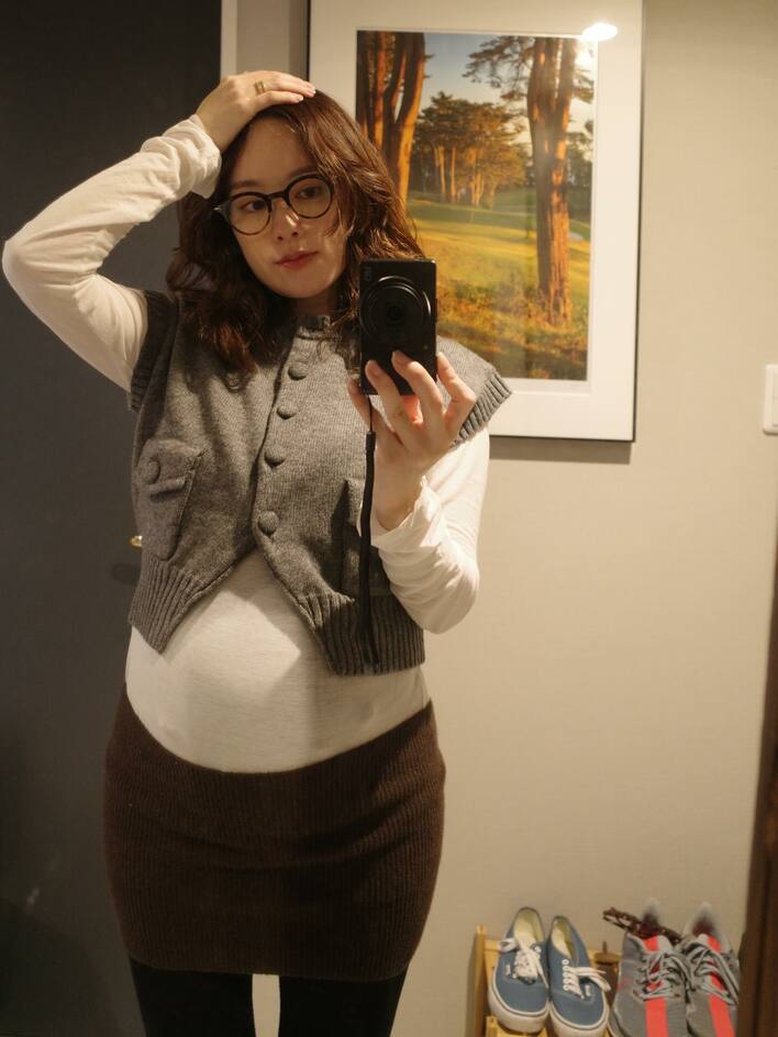 黒のカーディガンを羽織った姿でおなかに手を添えてみたりと、マタニティライフを楽しんでいるようですね。