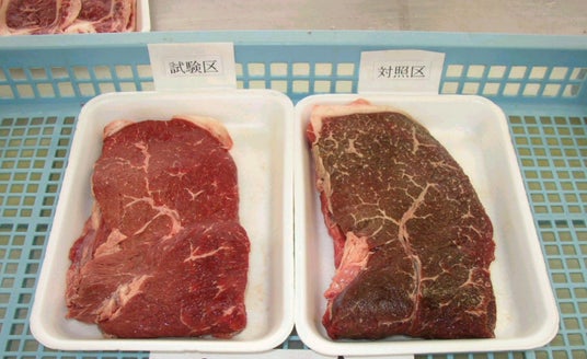 牛肉ははじめ鮮やかな赤色ですが、時間が経つと、色がだんだん茶色く変色します。これは、牛肉の中にある「ミオグロビン」という成分が酸化することが原因です。