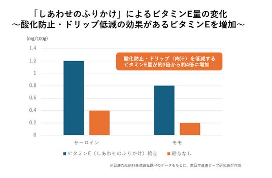 「しあわせのふりかけ」には、この変色を防ぐため、強い抗酸化作用があり、お肉の酸化を防ぐビタミンEを高濃度で配合しています(15,000mg/kg)。そのため、店頭に並んだ後も、鮮やかな赤色を長く保つことができる牛肉になります。