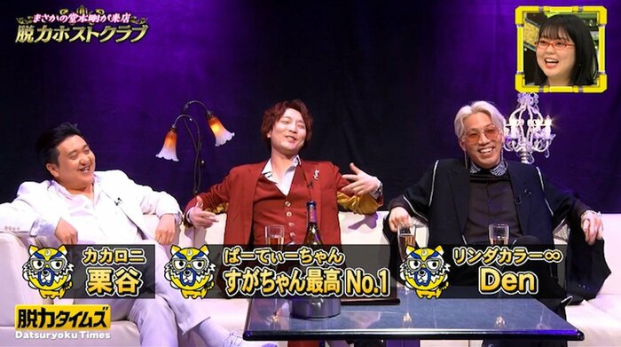 Den(リンダカラー∞)さん、すがちゃん最高No.1(ぱーてぃーちゃん)さん、栗谷(カカロニ)さんによる、カリスマホスト3人衆が迎えました。