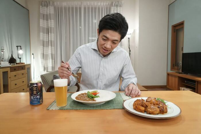 その後、自宅の部屋にシーンは変わり、“夏の味”の「金麦」で晩酌をし、舌鼓を打つといった、こちらもドラマの一幕のようなストーリーが描かれます。