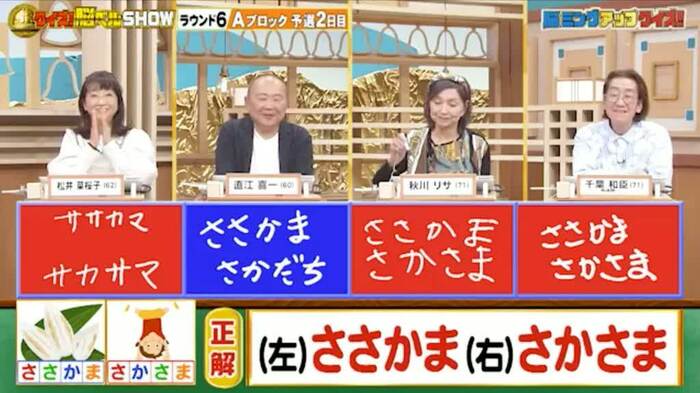 正解は「ささかま(笹かま)」と「さかさま(逆さま)」。松井さん、秋川さん、千葉さんが正解。