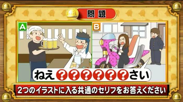 次は、共通セリフ問題。次の2つのイラストに入る共通のセリフを答えてください。